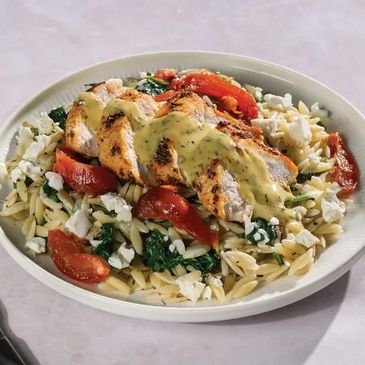 Ingredients: Risoni (41%) (Wheat), Chicken (18%), Spinach, Sundried Tomato Strips (Sundried Tomato, Canola Oil, Salt, Acid (330), Sugar, Herbs, Garlic, Vinegar, Water, Preservative (223)), Crumbled Feta (4.5%) (Milk), Water, Apple Cider Vinegar, Canola Oil, Almonds, Lemon Juice (2%) (Sulphites), Dijon Mustard, Sugar, Marinade (Acidity Regulators (327, 451, 450), Thickeners (407, 412)), Garlic, Italian Herbs, Chia Seeds, Sweet Paprika, Salt, Chicken Booster, Thyme, Black Pepper, Parsley, Oregano Mix, Vinegar And Cultured Sugar.