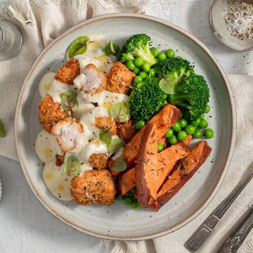 Ingredients:Sweet Potato (35%), Broccoli (19%), Chicken (17%), Water, Breadcrumb (Wheat), Flour (Wheat), Whole Egg, Milk Powder (1.5%), Butter (Milk), Garlic (1%), Chicken Booster, Parmesan Cheese (Milk), Salt, Thyme, Garlic Salt, Sweet Paprika, Mustard Flour, Onion Powder, Ground Ginger, Oregano Mix, Black Pepper, White